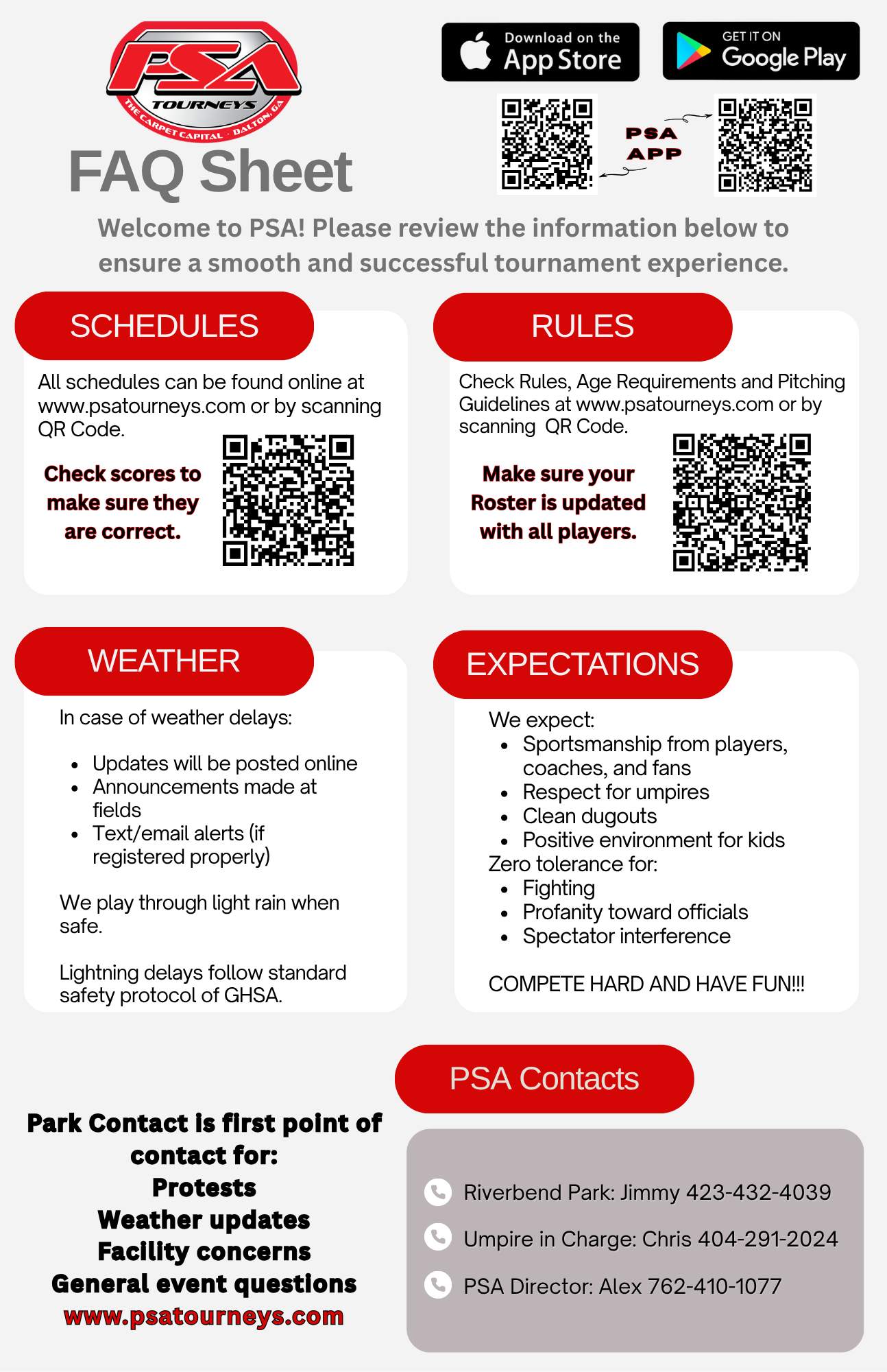 All event related questions should be directed to Baseball Director-Alex at psatournaments.northga@gmail.com or call 762-410-1077.